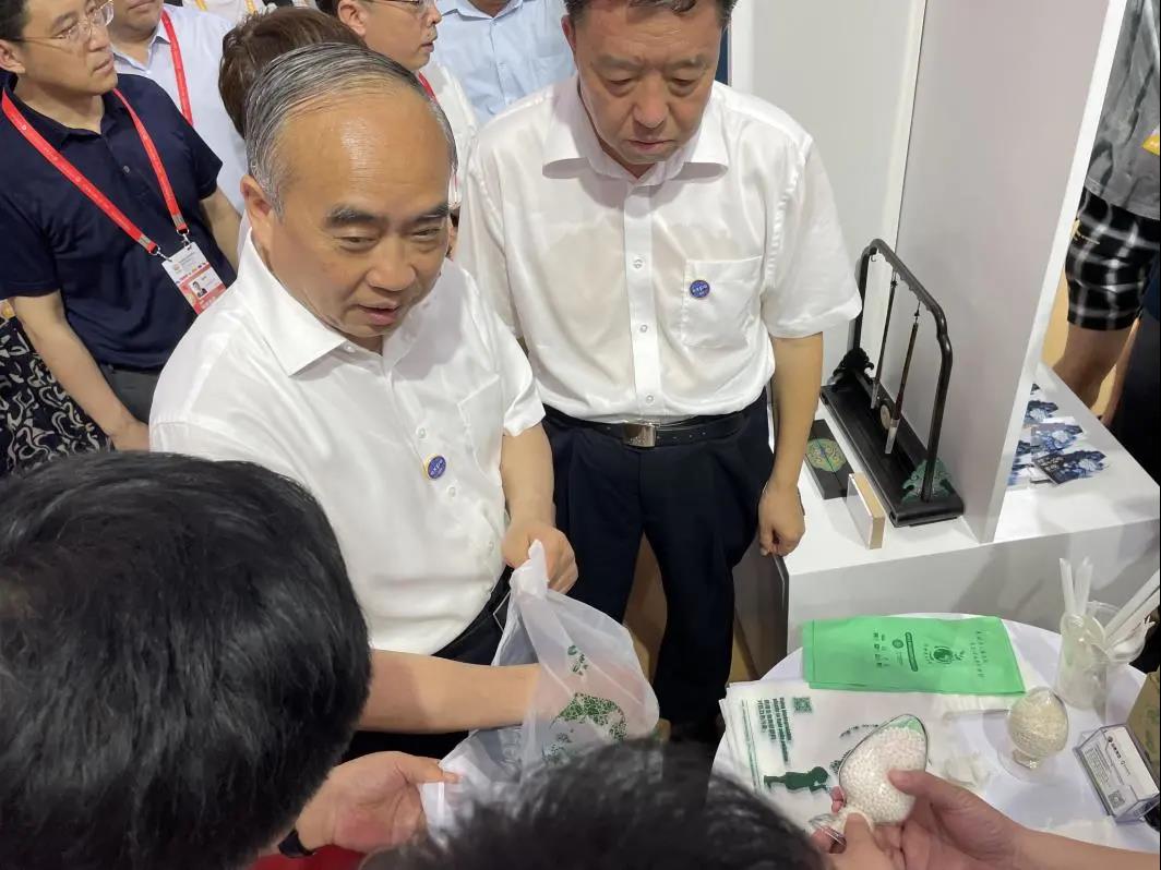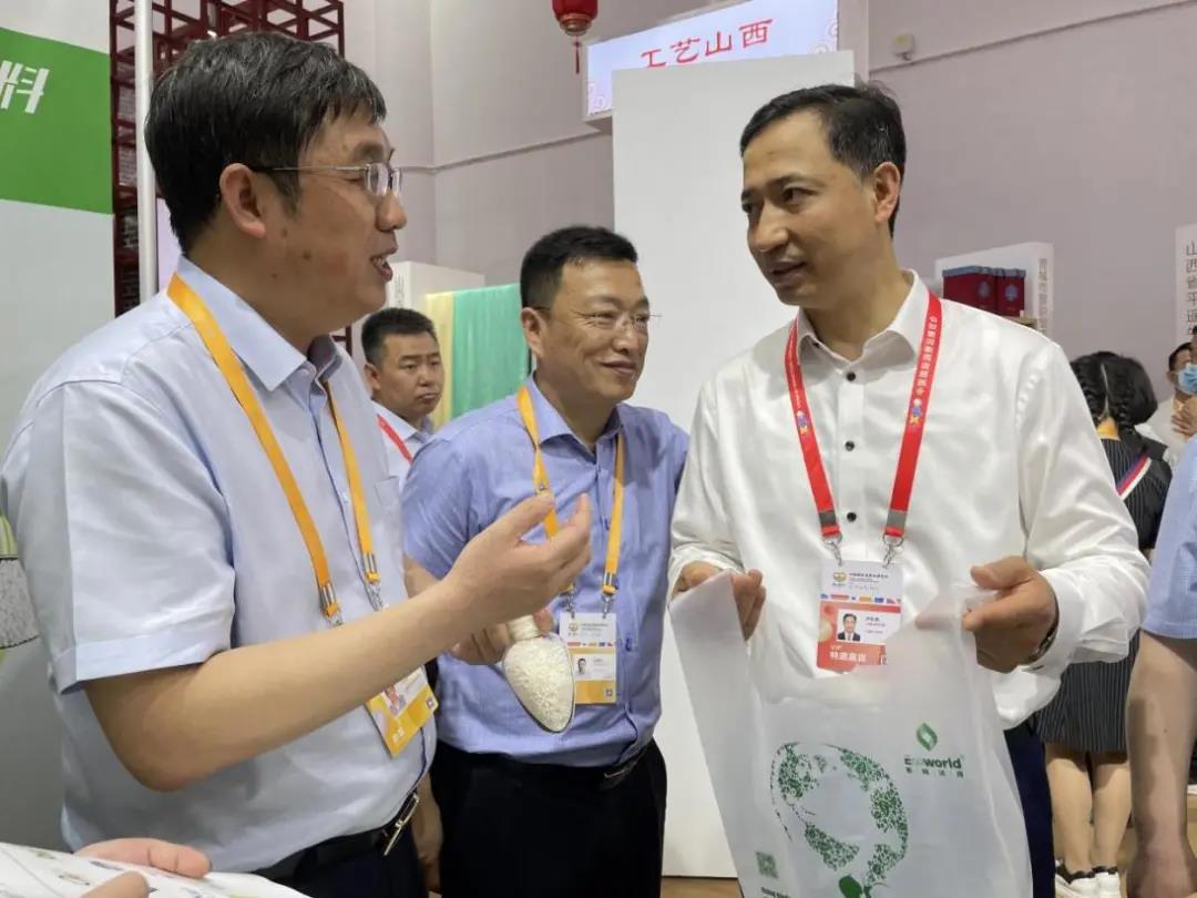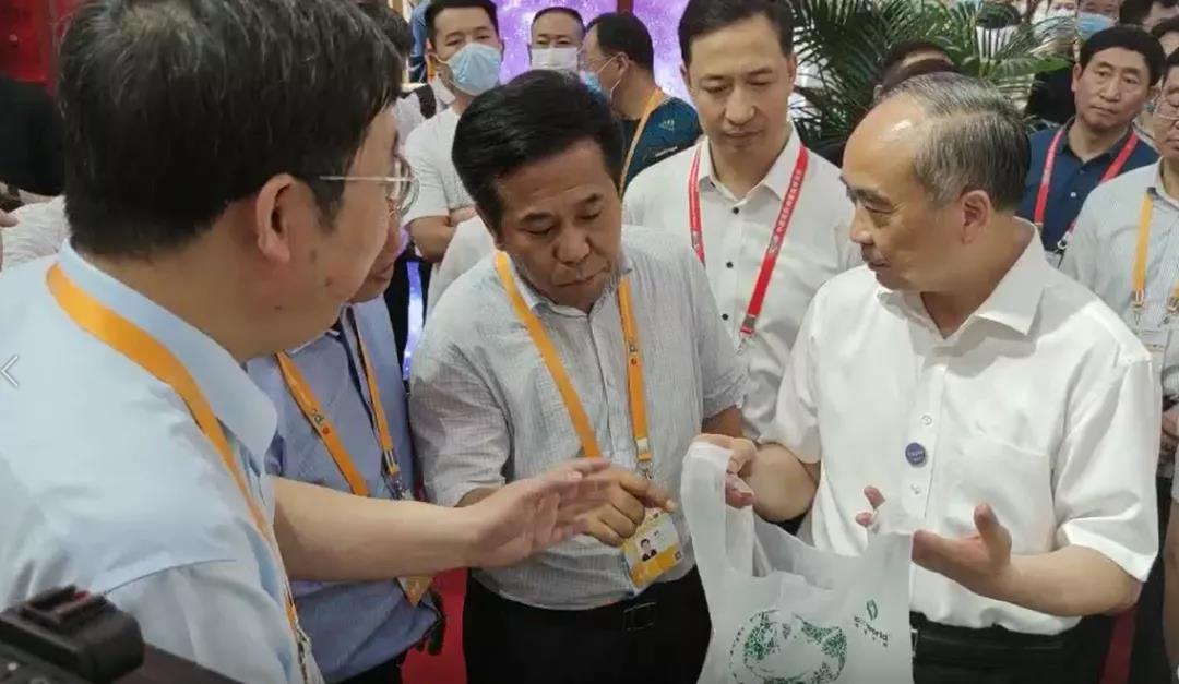 山西省省長(zhǎng)林武在金暉兆隆公司展臺(tái)仔細(xì)觀看展品,并且詳細(xì)了解生物降解產(chǎn)品的性能、效益、應(yīng)用領(lǐng)域,勉勵(lì)企業(yè)加快推廣應(yīng)用,促進(jìn)全社會(huì)形成綠色生產(chǎn)生活方式。