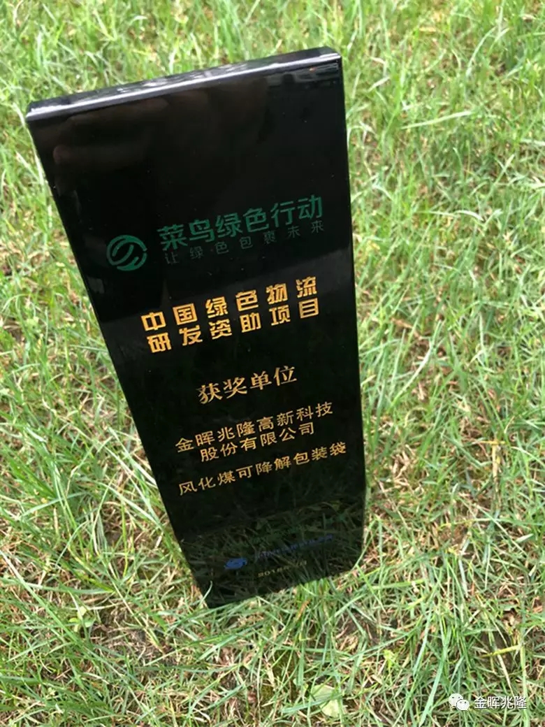 金暉兆隆作為全球生物降解塑料行業(yè)領跑者,所研發(fā)項目“風化煤可降解包裝袋”在本次峰會中榮獲菜鳥綠色行動“中國綠色物流研發(fā)資助項目”的榮譽。